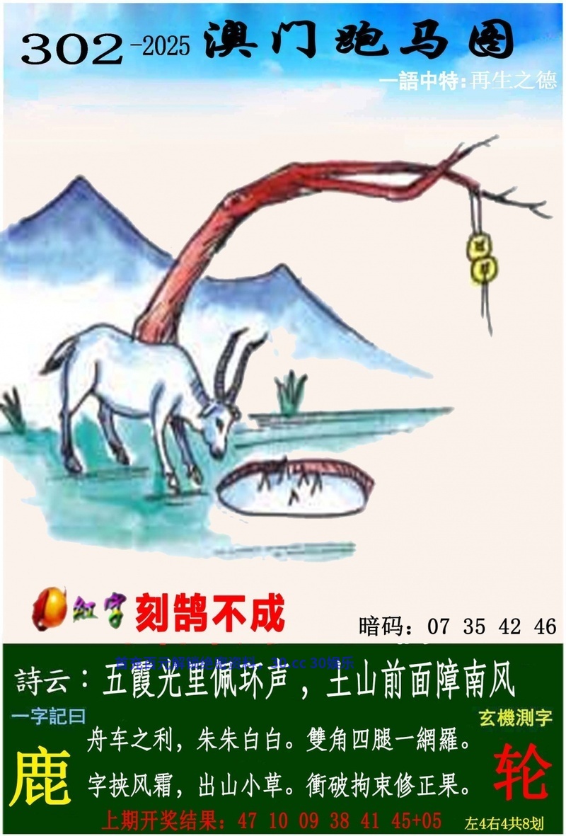 | 302期:一字記曰:【鹿】 舟车之利,朱朱白白,双角四腿一网罗。字挟风霜,出山小草,冲破拘束修正果 玄机测字《轮》 解:双角四腿一网罗:双角四腿解双虎马狗猴龙鼠 综合取肖:虎马狗猴龙鼠 |